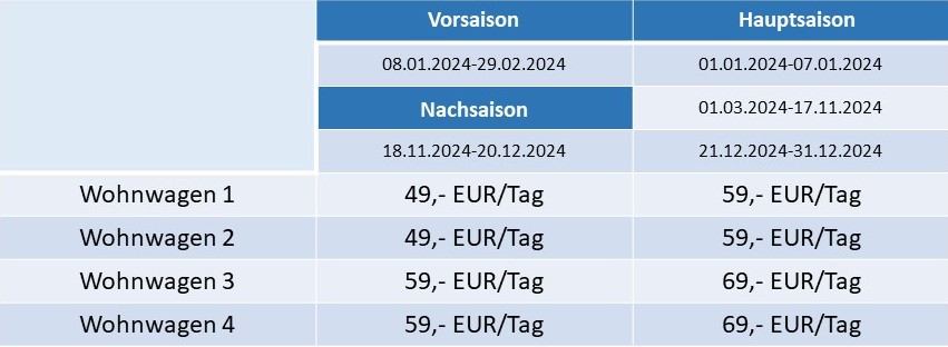 Die oben aufgeführten Preise sind Tagesmietpreise und beinhalten bereits 19 % MwSt.